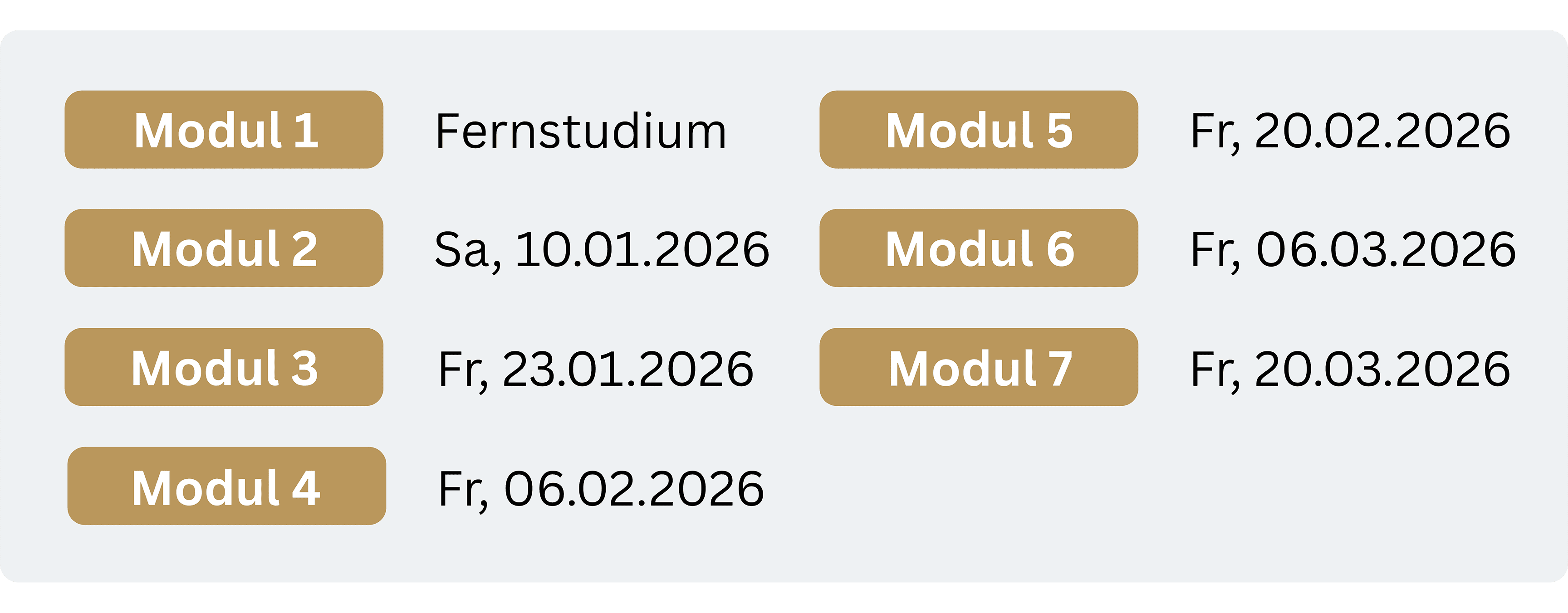 ⓘ Wenn die Termine für Sie passen, müssen Sie nichts weiter anpassen. Sollten Sie an einzelnen Terminen verhindert sein, können Sie Ersatztermine wählen oder das entsprechende Modul im Fernstudium absolvieren. Terminwechsel sind auch während der Ausbildung möglich – die Module müssen nicht in Reihenfolge absolviert werden.