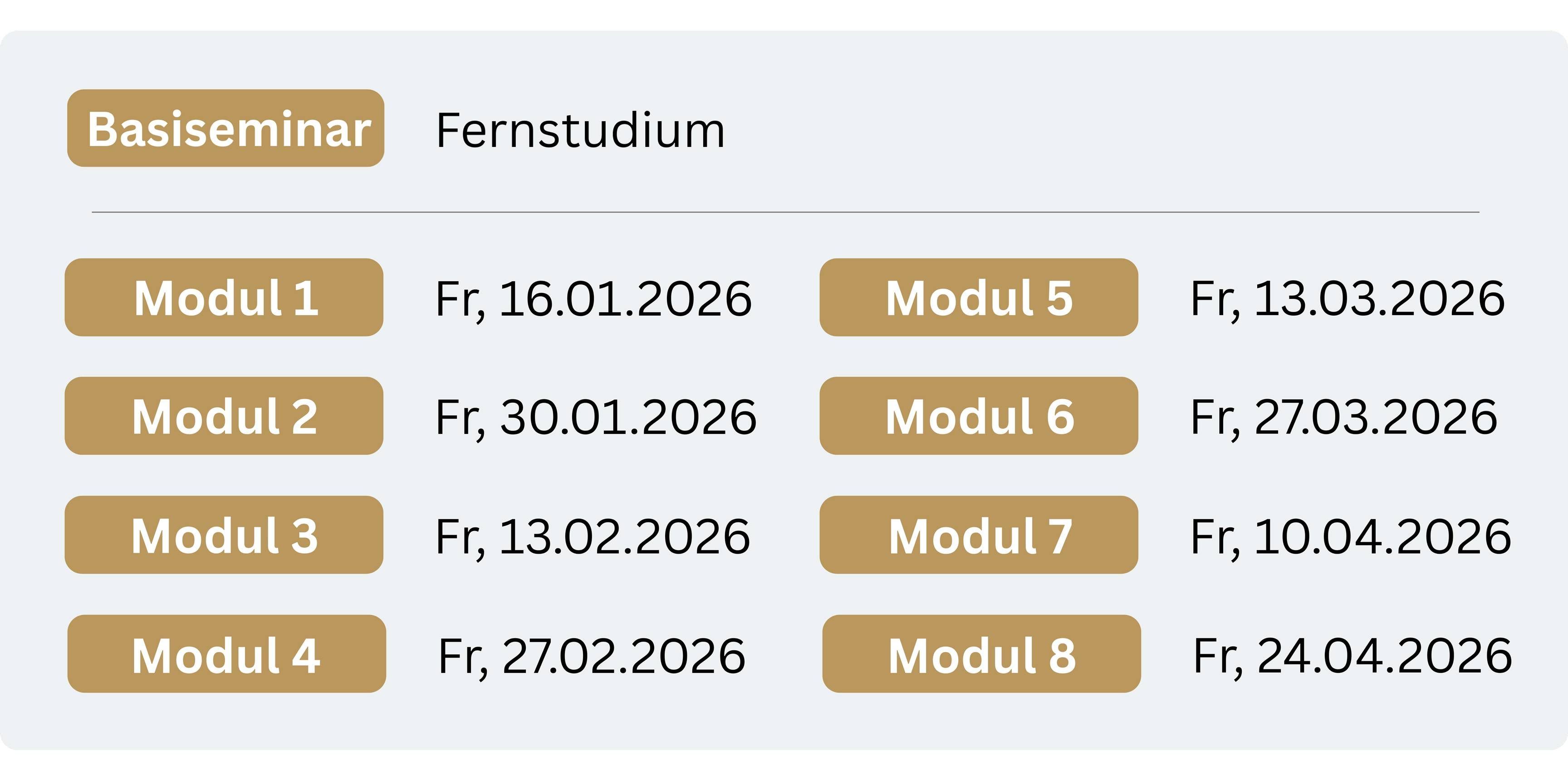 ⓘ Wenn die Termine für Sie passen, müssen Sie nichts weiter anpassen. Sollten Sie an einzelnen Terminen verhindert sein, können Sie Ersatztermine wählen oder das entsprechende Modul im Fernstudium absolvieren. Terminwechsel sind auch während der Ausbildung möglich – die Module müssen nicht in Reihenfolge absolviert werden.